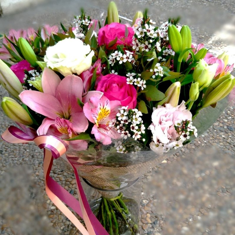 זר פרחים עשיר על טהרת הורוד המשלב ליליות ורודות, ורדים ורודים, פרחי שעווה או פלוקס וליזיאנטוס .